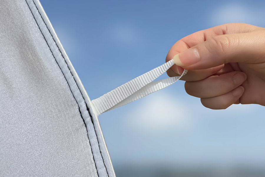 We recommend that you use a steamer to remove any creases from the polyester fabric. It’s also possible to use a warm iron, but it is important that you use an ironing cloth so that the iron does not make contact with the fabric.