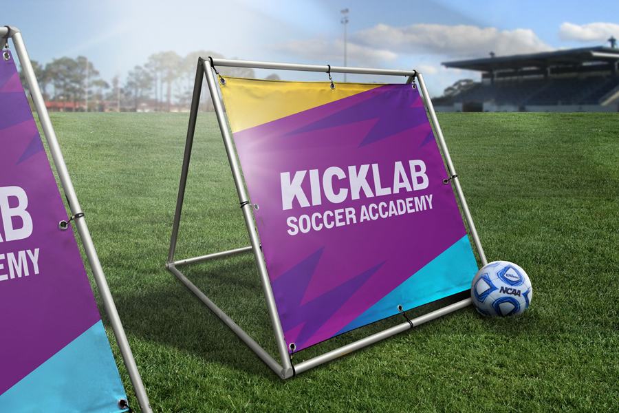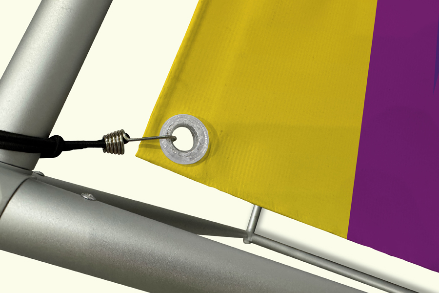 The printed Banner attaches to the frame with bungee cords that are placed around the frame and hooked into our clear eyelets. This keeps the print taut and ensures there are no wrinkles in your designs.