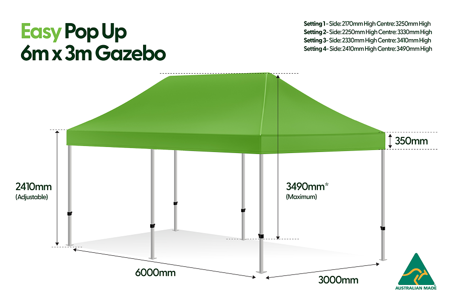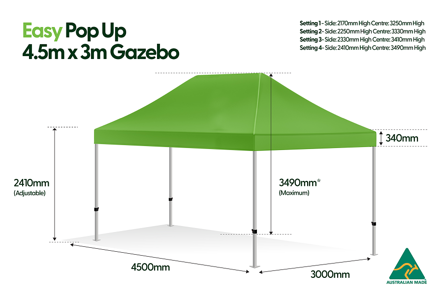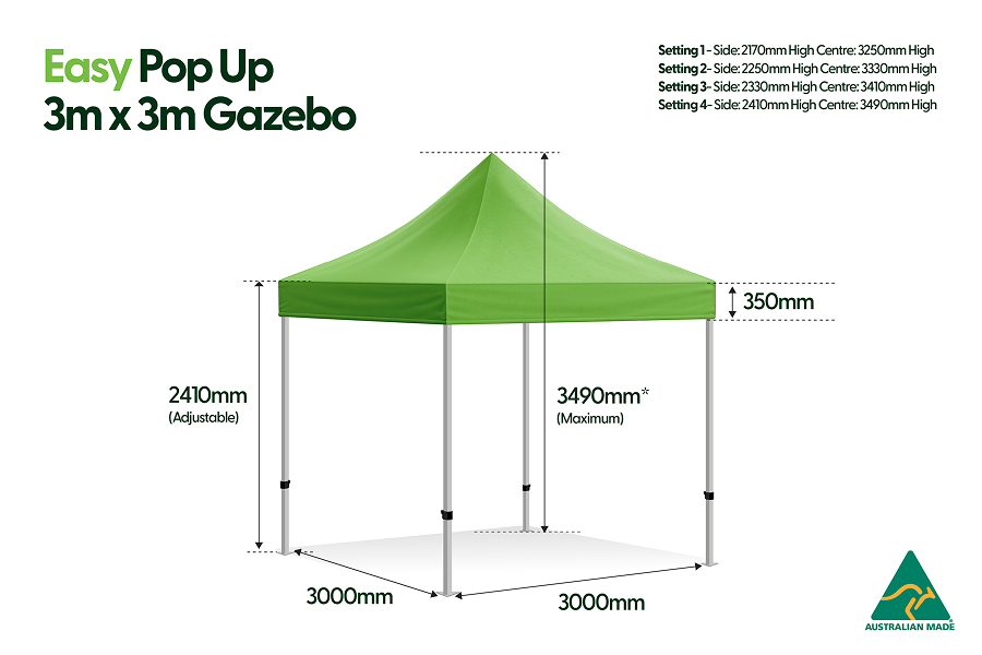 The Pop Up Gazebos have 4 adjustable height settings. Measurements below show side height (bottom to top of vertical posts) and centre height (floor to top of canopy)