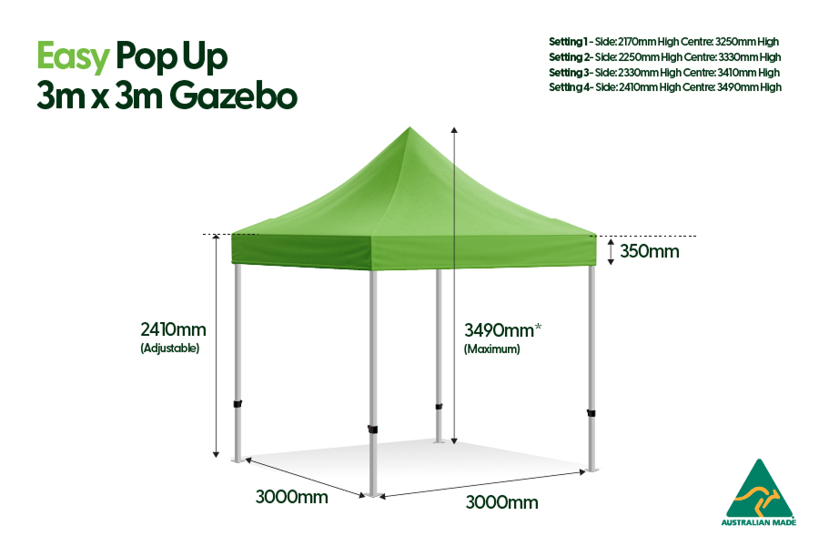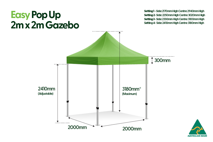 The Pop Up Gazebos have 4 adjustable height settings. Measurements below show side height (bottom to top of vertical posts) and centre height (floor to top of canopy)