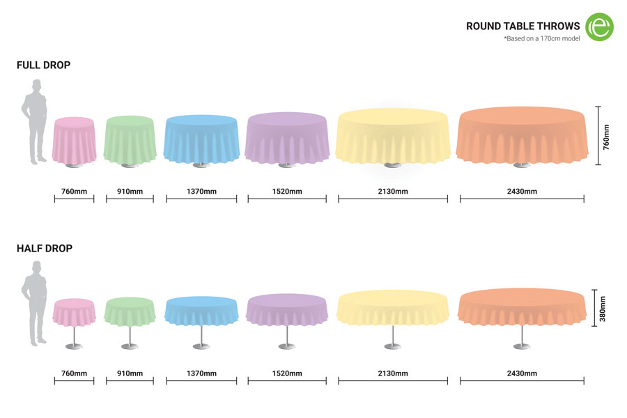 The sizes available are designed for the diameter of the table, with either a full drop (760mm H) or half drop option (380mm H).
